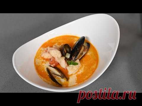 Сливочный суп с морепродуктами. Тосты с кремом из авокадо и огурцом