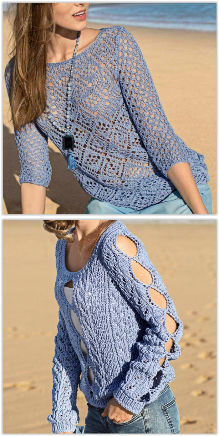 2 эффектные модели на лето в голубом цвете: Пуловер с ромбами и Джемпер вырезами (описание, схемы, выкройки)