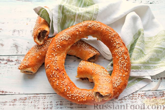 Рецепт: Дрожжевые бублики с мясной начинкой и кунжутом на RussianFood.com