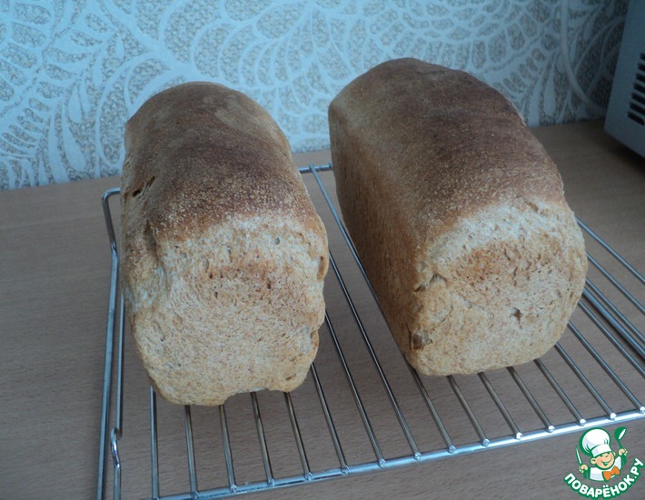 - Опара: В рассол комнатной температуры добавить дрожжи, соль и сахар. Определяем активность дрожжей по появлению пенной "шапочки". Добавить цельнозерновую муку и 100 гр. пшеничной хлебопекарной высшего сорта. Замешать нашу опару и поставить в холодильник на ночь. Подошедшая таким образом опара практически никогда не опадает, что позволяет всегда получать заведомо пышный хлеб. Вот такая опара ждала меня утром в холодильнике. Добавляю к опаре оставшуюся муку, масло и замешиваю тесто. Вымешиваю не менее 10 минут. За счет примеси цельнозерновой муки тесто слегка липнет к ладоням. Перекладываю в ёмкость, накрываю полиэтиленовой плёнкой, чтобы тесто не заветрилось. Выполняю 2 обминки- через 30 минут и через 60-90 минут. Тесто увеличивается в объёме в 2-2.5 раза. Делю на 2 равные части. Приступаю к формовке. Для получения равномерной и некрупной пористости надо плотно скручивать рулетик, прижимая тесто так, чтобы лопались все пузырьки в нём. Вот такой симпатишный рулетик у меня скрутился. Шов- внизу. Уложила свои заготовки в смазанную маслом форму. Швом вниз. Оставила для окончательной расстойки на 30-40 минут. Накрыла пленкой, чтобы не заветрились. Вот такой подъём получился. Духовку грею до 220 С. На низ духовки ставлю сковороду и прогреваю её тоже. Ставлю форму в разогретую духовку и наливаю на сковороду воду для пара. При такой температуре и с паром выпекаю около 10-15 минут. Потом сковороду убираю и снижаю температура духовки до 180 С. Пеку около 30-40 минут. Вот такие красавцы у меня получились))) Достала из формы и оставила остывать на решетке. Потом- в хлебницу. Если кого-то интересует срез- такой он. Вполне симпатишный)))