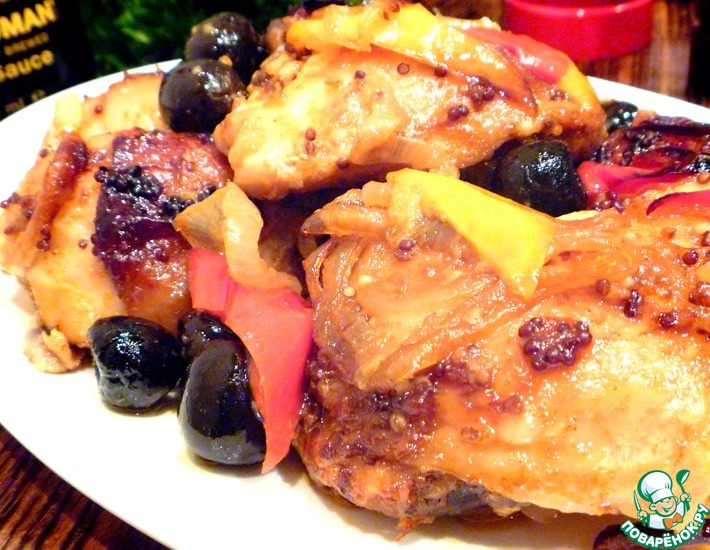 - Продукты для приготовления Куриные бедра хорошо промойте, обрежьте лишнюю кожу и жир, просушите бумажным полотенцем. Приготовьте маринад: Чеснок выдавите через пресс, смешайте с паприкой и зерненой горчицей (1 ст. л.), добавьте растительное масло (3 ст. л.), соевый соус (2 ст. л.) и лимонный сок (1 ст. л.). Получится кашицеобразная смесь. Подготовленные части курицы сложите в контейнер, залейте маринадом, оставьте промариноваться на час и более. Крупно нарежьте лук и сладкий перец, немного посолите, добавьте пару столовых ложек масла. В форму для запекания выложите промаринованные куски курицы (вместе с маринадом), поверх курицы положите овощи и маслины. Форму поместите в рукав для запекания (курочка будет более сочная, и духовка останется чистая) Духовка разогрета до 200 градусов, готовьте минут 45-50. После запекания на дне формы остается очень вкусный соус, можно приготовить рис и смешать его с соусом от курицы с овощами. Это очень вкусно! Приятного аппетита!!!