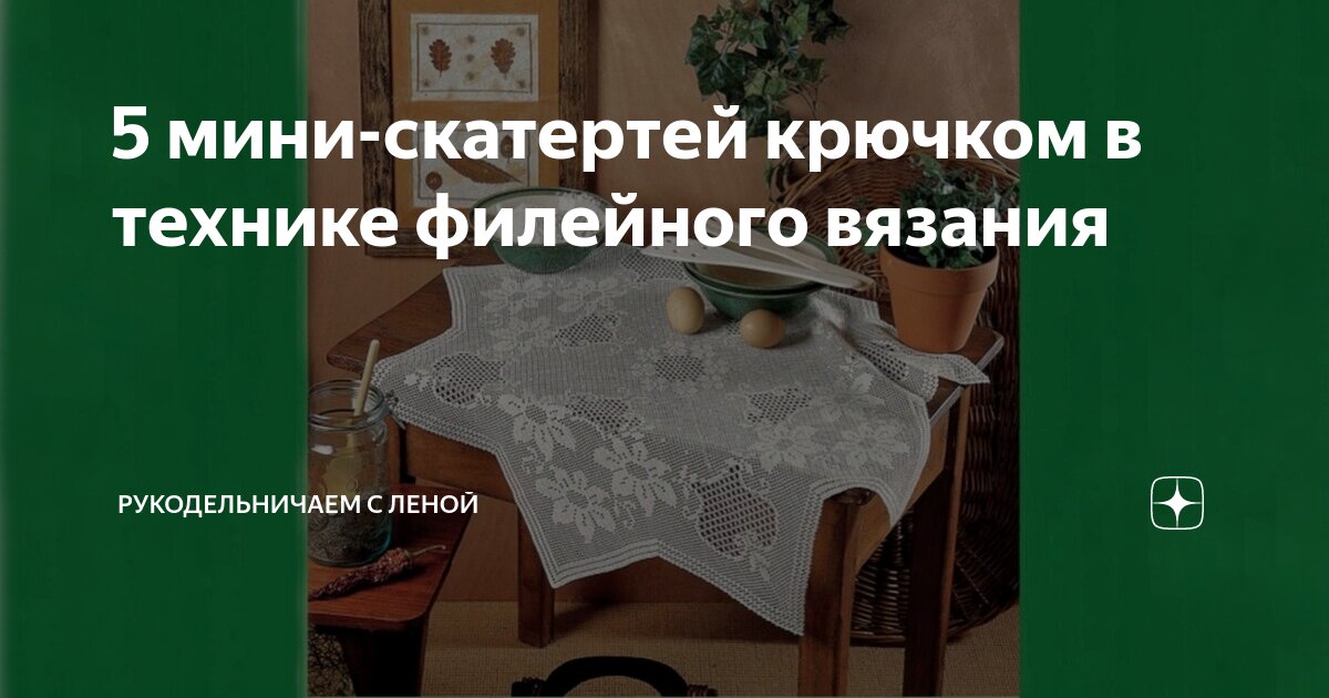 5 мини-скатертей крючком в технике филейного вязания Статья автора «Рукодельничаем с Леной» в Дзене ✍: Приближается лето, а это период, когда можно уже на веранде, летней террасе или на улице накрыть стол, чтобы позавтракать, расстелить красивую...