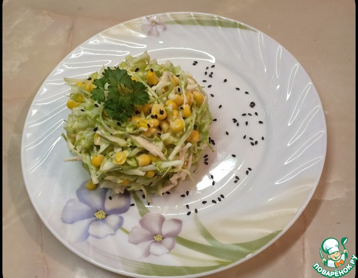 - Капусту тонко нашинковать и слегка примять руками. Отварное мясо или ветчину нарезать соломкой. Если вы будете использовать мясо, то его лучше руками разделить на волокна, так салат будет нежнее. Кукурузу откинуть на дуршлаг, чтобы удалить излишки жидкости. Выложить капусту в салатницу, добавить ветчину и кукурузу. Посолить, заправить майонезом и все хорошо перемешать. * Приятного аппетита!