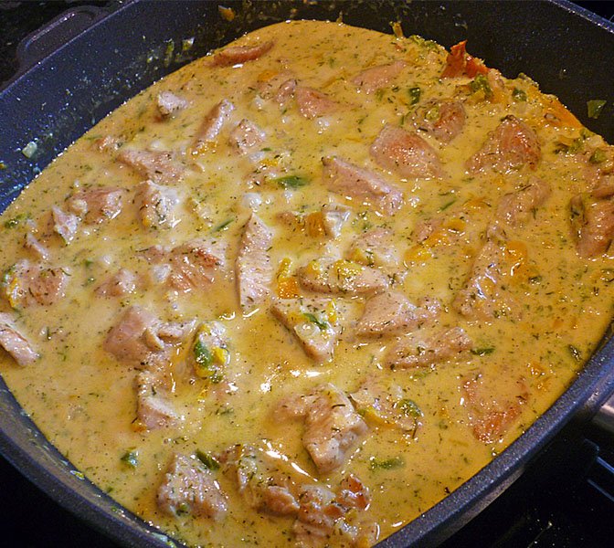 GESCHNETZELTES MIT HONIG SENFSAUCE - kochen tipps ZUTATEN: 1 Paprikaschote(n), rot1 Paprikaschote(n), grün1 kg Putenfleisch (oder Schwein)400 g Schlagsahne4 EL Senf4 EL Honig4 Zwiebel(n)Dill ZUBEREITUNG: Das Fleisch in Würfel schneiden, salzen und pfeffern und gut anbraten. Rote und grüne Paprikaschote sowie Zwiebeln im “Speedy” klein hacken oder möglichst klein schneiden. Sahne zum Fleisch geben, gehackte Paprika und Zwiebeln zugeben. Danach vorsichtig mit