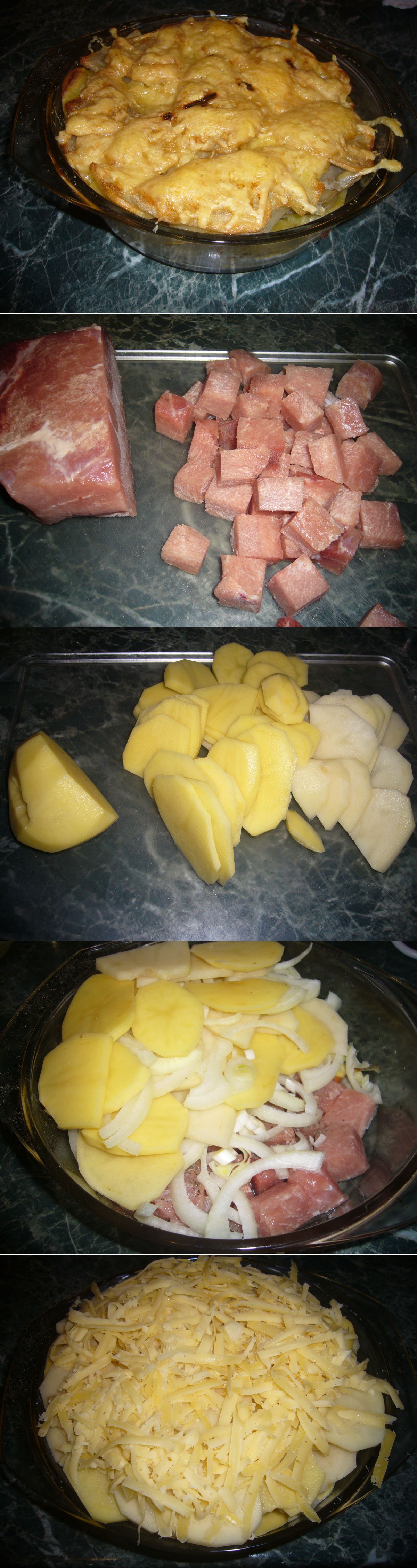 Картошка по французски. 300 гр. свинины, 2 луковицы, 5 картофелин, 100 гр. сыра, соль, перец — по вкусу.