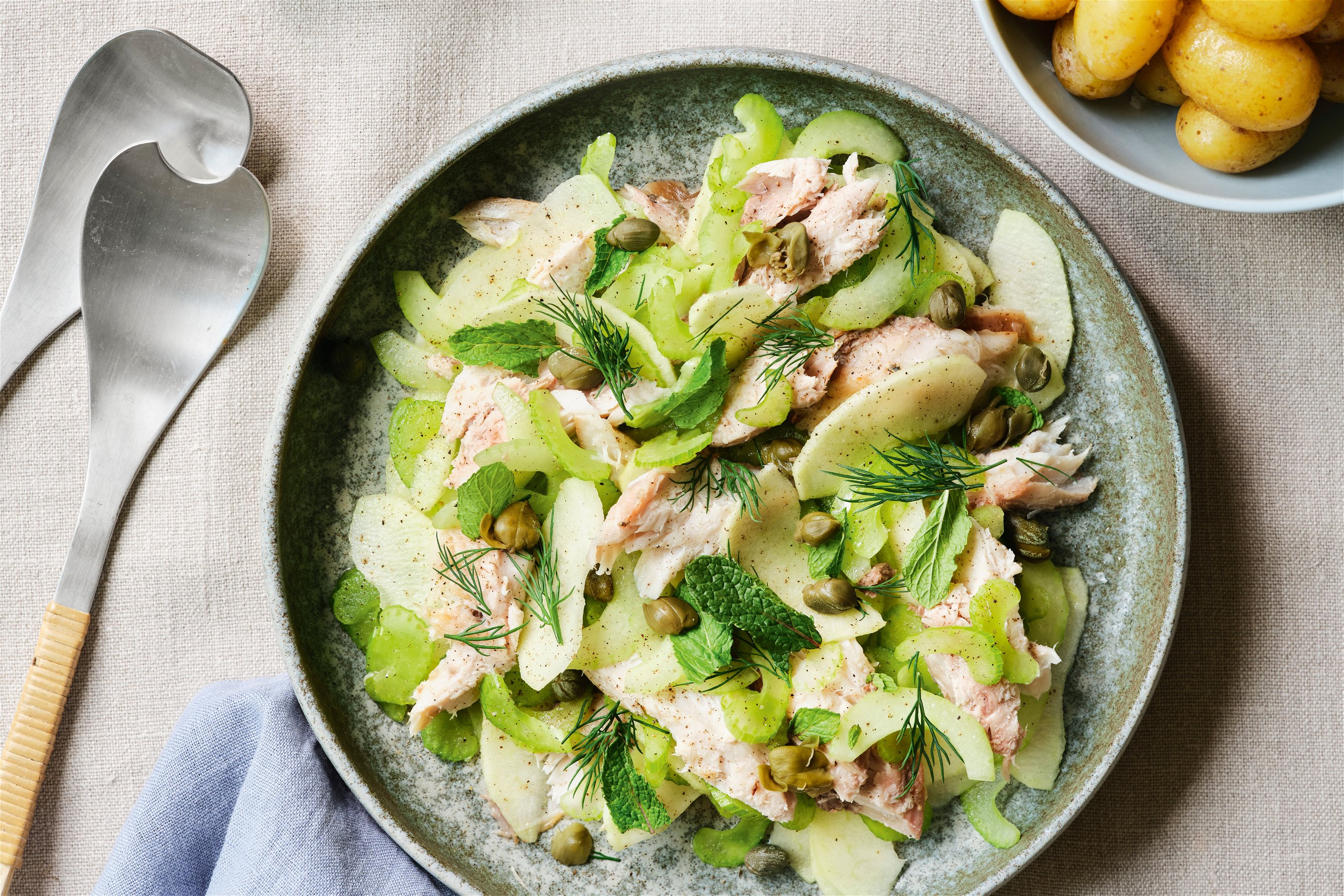 Salat mit Makrele, Sellerie, Apfel und Dill - Falstaff Die raffinierte Kombination aus saftiger Makrele, knackigem Sellerie, süßem Apfel und aromatischem Dill wird Sie begeistern.