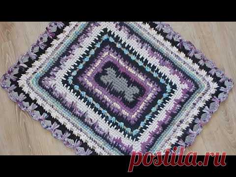 КОВРИК ПРЯМОУГОЛЬНЫЙ. Связан крючком из ненужных вещей без узелков и сшиваний . Авторское решение.