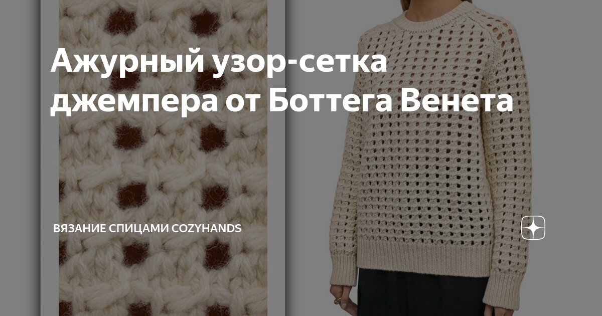 Ажурный узор-сетка джемпера от Боттега Венета Статья автора «Вязание спицами CozyHands » в Дзене ✍: Всем привет! Сегодня разберу ажурный узор джемпера от Боттега Венета. Узор напоминает сетку с фактурными элементами.