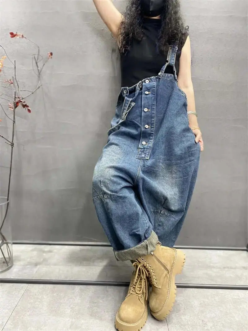 Blue Denim Retro Drop Crotch Overalls for Women - Thebesttailor