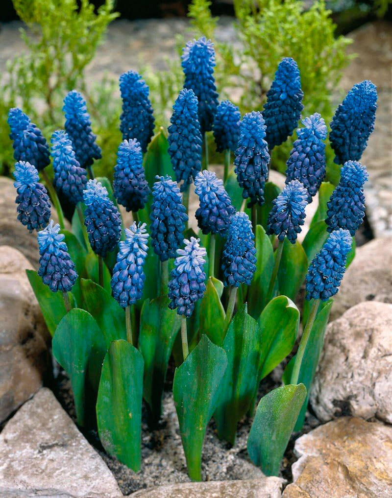 Многолетний садовый цветок Мускари (Muscari). Луковичный многолетник высотой 12-20 см. Луковица пленчатая, 2-3 см в диаметре. Листья приземные узкие. Цветки душистые, мелкие - синие, голубые, фиолетовые, белые, собраны в кистевидное соцветие. Цветет в мае - июне.