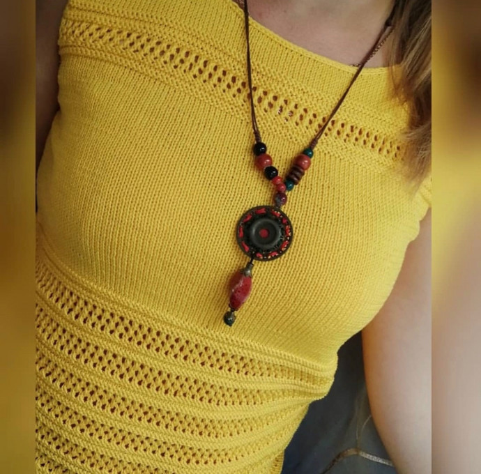 Желтый женский топ с ажурными дорожками, связанный спицами
