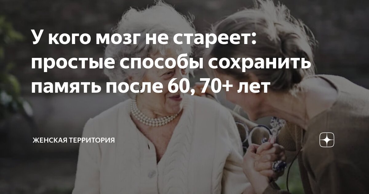 У кого мозг не стареет: простые способы сохранить память после 60, 70+ лет Статья автора «Женская территория» в Дзене ✍: Геронтологи- психиатры настаивают, что сохранение памяти и других ментальных способностей после 60 лет не только желательно, но и очень даже достижимо.