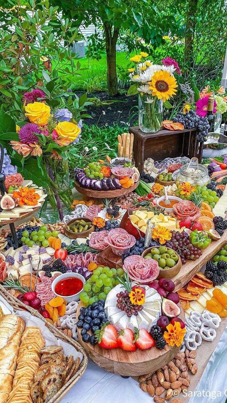 На изображении показан большой стол с разнообразным ассортиментом закусок на свежем воздухе. На столе представлены различные сыры, мясные нарезки, фрукты, конфеты, хлеб и выпечка. Также видны цветочные композиции в вазах. Фон украшен зеленью деревьев и кустарников.