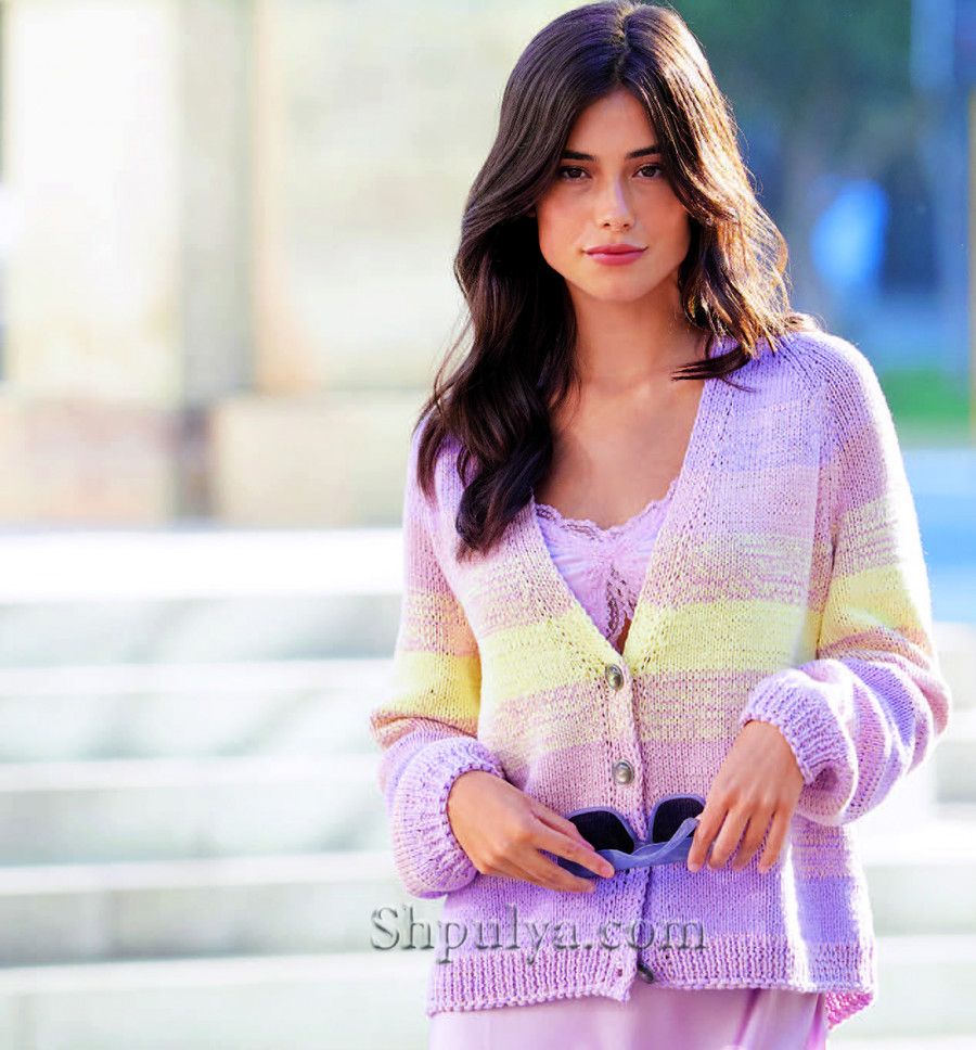 Полосатый кардиган с рукавами реглан из натурального хлопка отличается контрастностью цвета, но без резких переходов. Поскольку в работе всегда находятся две нити, пастельные оттенки постепенно сменяют друг друга.