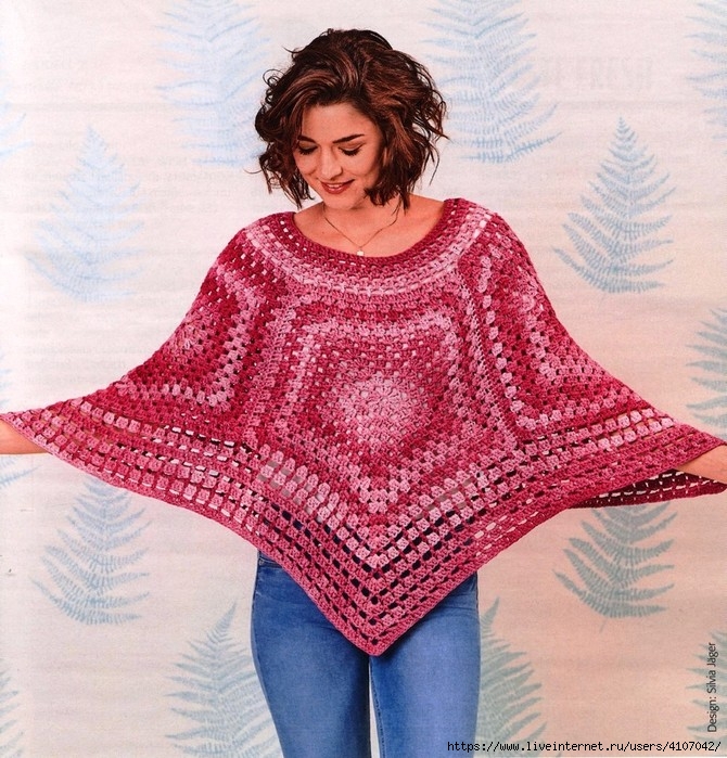 ПОНЧО "БАБУШКИНЫМИ" ПЯТИУГОЛЬНИКАМИ ИЗ СЕКЦИОННОЙ ПРЯЖИ
