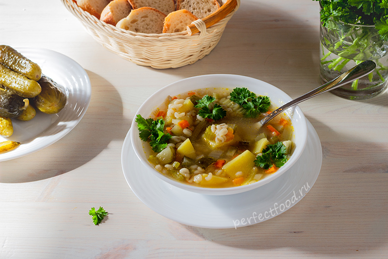 Постный рассольник с перловкой,солёными огурцами и тофу