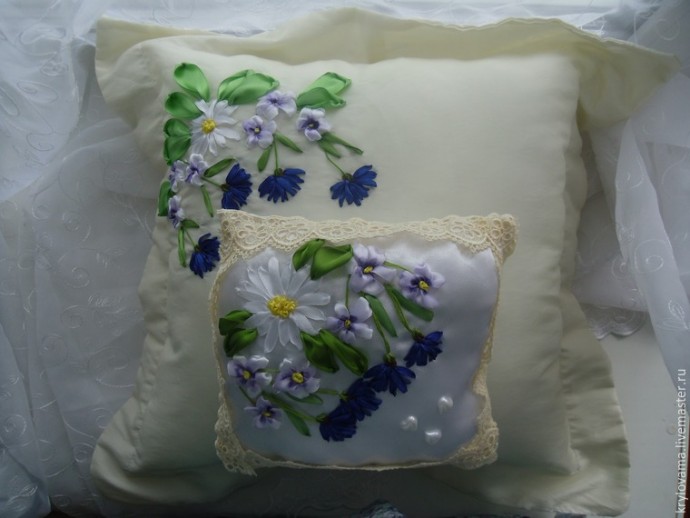 Вышивка лентами на свадебной подушечке Вышивка лентами на свадебной подушечкеНам потребуется: пяльца, ткань белый атлас, размером 23х23 см, лента атласные 0.6 см и 1.0 см белого, желтого, зеленого, синего цвета, шелковая лента 2.5 см, нитки мулине зеленого и коричневого цвета, краски по ткани, кружево, иглы, ножницыРисуем...