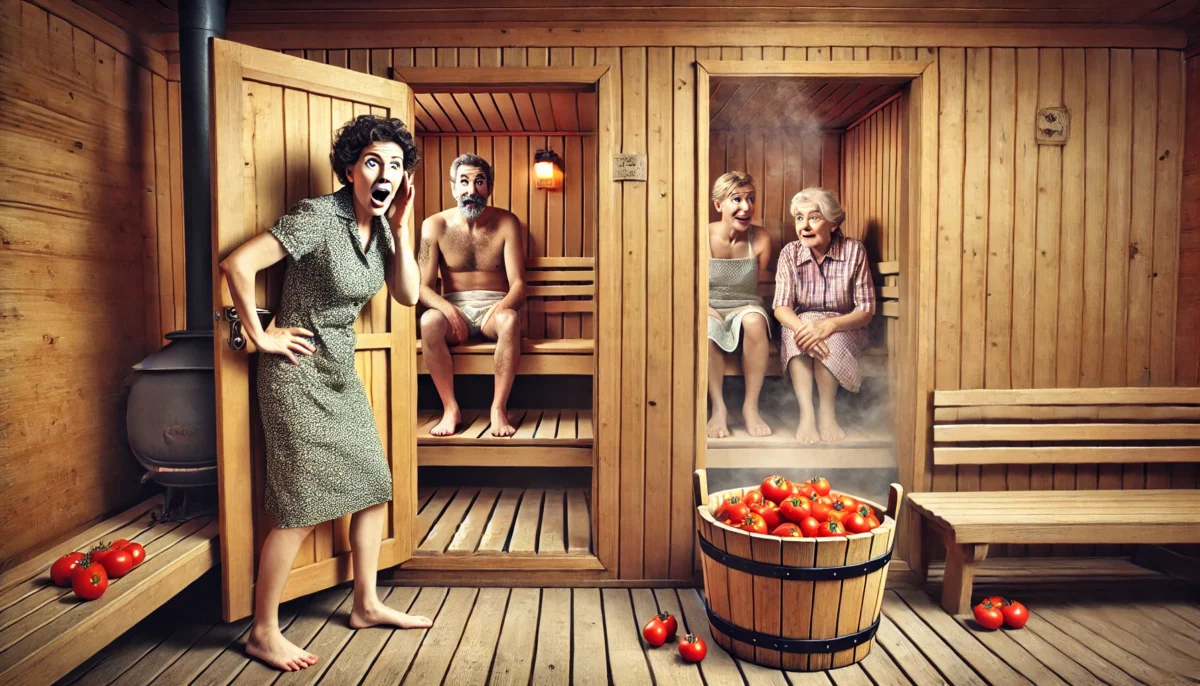 Изображение показывает людей в бане с деревянными стенами и лавками. Мужчина и женщины сидят внутри сауны, в то время как одна женщина стоит у двери и держится за голову. Также показана большая ведёрко с томатами.