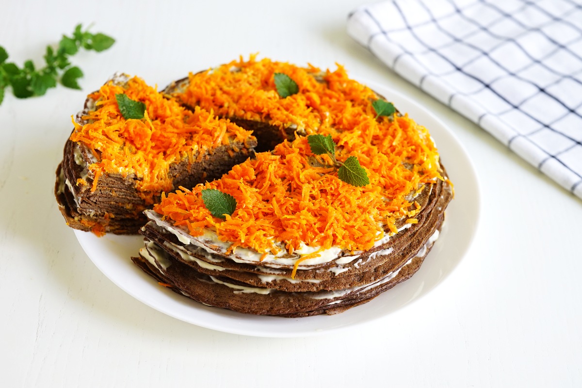 Печеночный торт, классический рецепт с фото и видео | Меню недели По классическому рецепту получается самый вкусный печеночный торт! Тонкие нежные блинчики, сочная начинка и яркий соус. Идеальное сочетание. Указаны калорийность и время приготовления