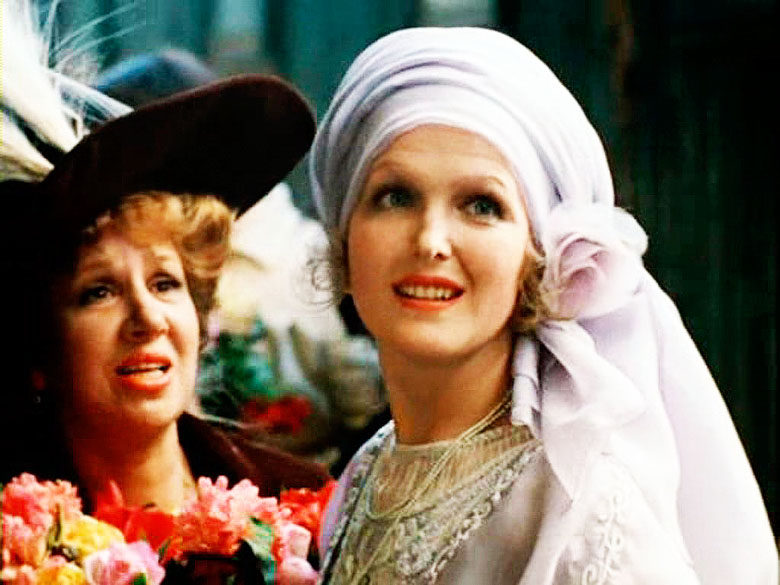 На изображении две женщины в старинных нарядах. Одна из них в большом шляпе, другая в светлом головном уборе и с цветами.