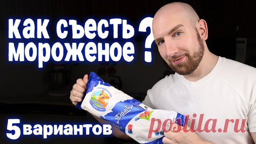 Человек держит упаковку мороженого. Текст на изображении гласит: "Как съесть мороженое? 5 вариантов." В правом нижнем углу логотип сайта "postila.ru".