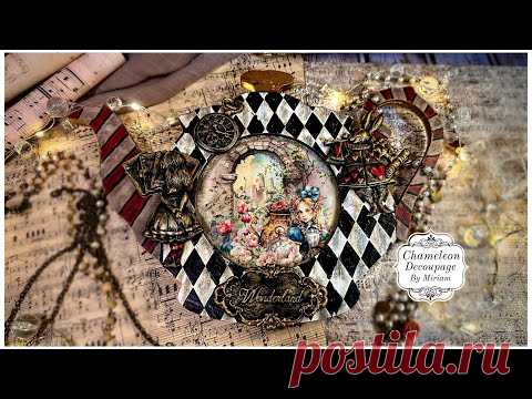 Декоративное панно в винтажном стиле с изображением Алисы в Стране чудес. Панно украшено различными элементами, такими как шахматные узоры, куклы и другие декоративные элементы. На панно также написана надпись "Chameleon Decoupage by Miriam".