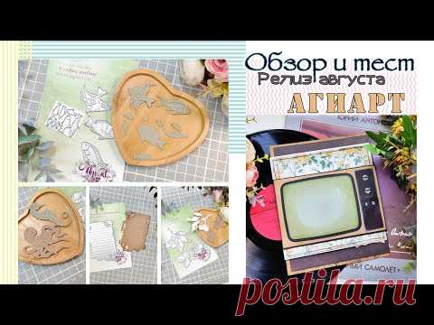Изображение содержит обзор и тест релиза августа от компании АгиАрт. На изображении показаны изделия для творчества, в том числе деревянные шаблоны в форме сердца и картонные шаблоны. На заднем фоне виден телевизор и надпись "Обзор и тест релиза августа АгиАрт".