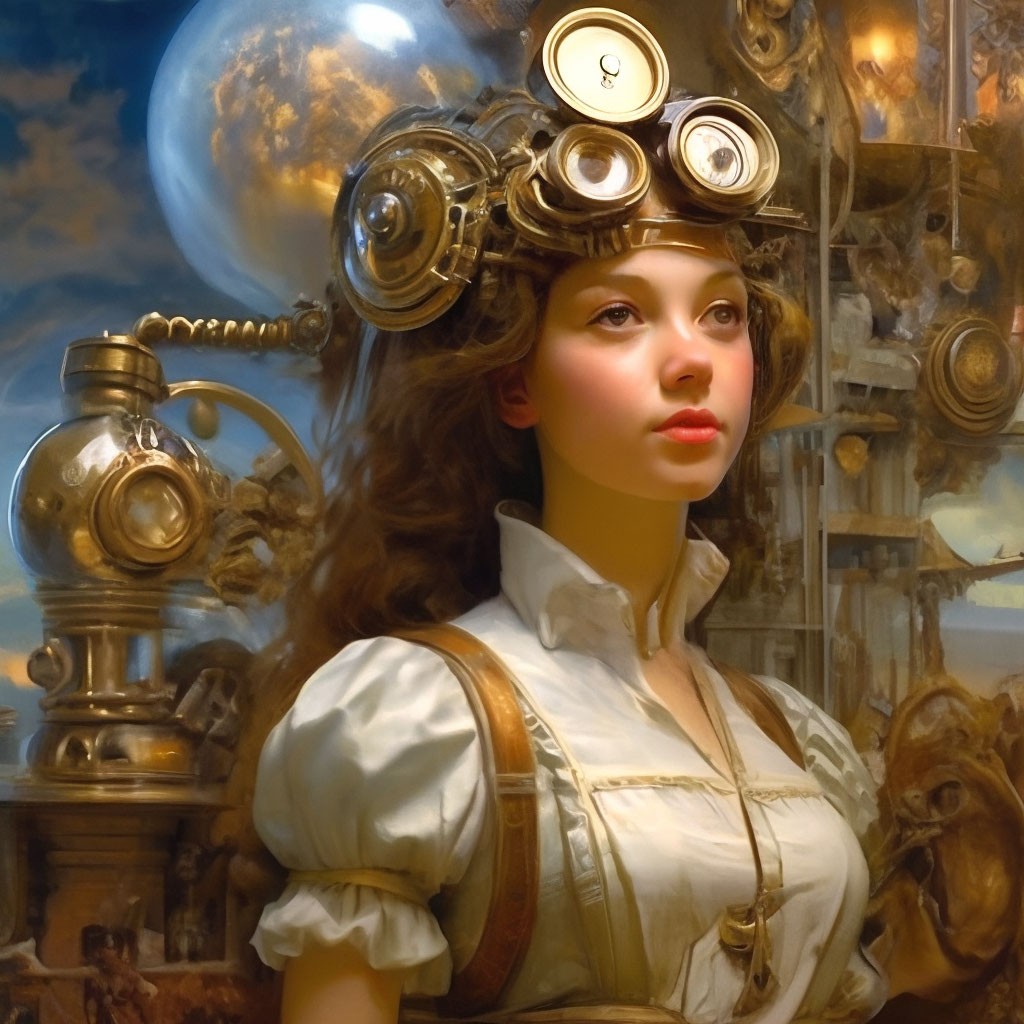 На изображении изображена молодая девушка в стиле стимпанк, одетая в белое платье с мехом. На её голове находится сложный головной убор из металлических шестерёнок и измерительных приборов. Вокруг неё элементы декора в стиле стимпанк, с металлическими трубами, колёсами и сферами.