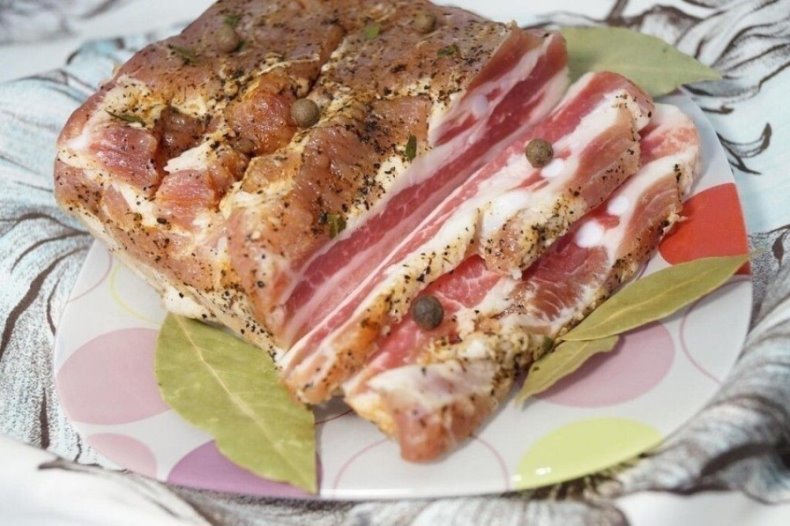 На литр воды один стакан (200г) - соли и половина такого стакана сахара , лавр. лист (не жалеть!), перец горошек , довести до кипения и остудить . Вот этим рассолом залить сало(1-2 кг). Сало можно сразу пересыпать чесноком. День стоит дома потом в холодильник примерно на сутки. Потом выложить на полотенце чтоб рассол сбежал. Можете добавлять по