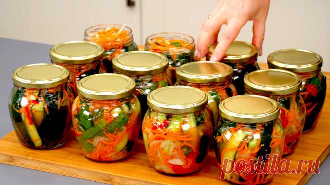 Салат "Под куриный шашлычок" • Огурцы - 4 кг (вес уже нарезанных) • Морковь - 1 кг • Лук - 1 кг • Перец сладкий - 300 г • Чеснок - 1 головка (8-9 зуб) • Кориандр молотый - 2 ч.л. • Зерна горчицы - 2 ч.л. • Перец красный чили - 0,5 ч.л. • Перец черный молотый - 1 ч.л. • Соль - 100 г (3 ст.л. с горкой) • Сахар - 1 стакан (200 г) • Уксус 9% - 1 стакан (200 г) *** Выход - 14-15 баночек по 0,5 л