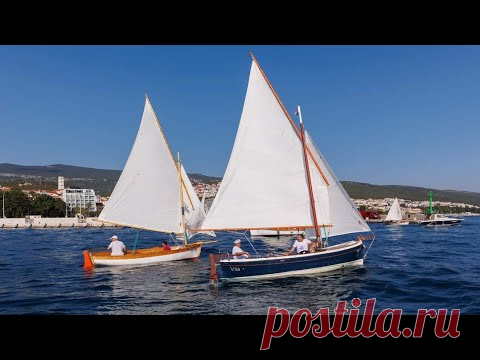 Изображение парусных лодок, плывущих по водоему на фоне города и холмов.