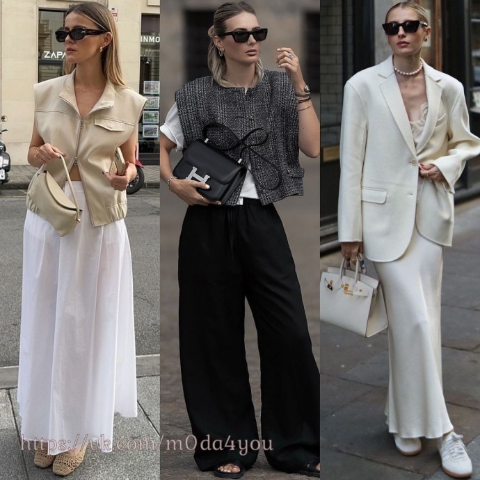 На изображении три женщины, каждая из которых одета в разные стильные наряды. Первая женщина слева в бежевой жилетке и белых широких брюках, вторая женщина в серой жилетке и чёрных широких брюках, а третья женщина в белом костюме с юбкой. Все женщины носят очки и сумки.