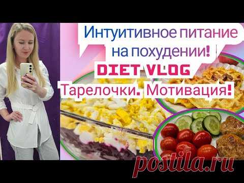 Это изображение показывает женщину, делающую селфи на фоне рекламы влога о диетическом питании. На рекламе написано "Интуитивное питание на похудении! DIET VLOG Тарелочки. Мотивация!". Рядом с текстом изображены блюда с овощами и салатами.