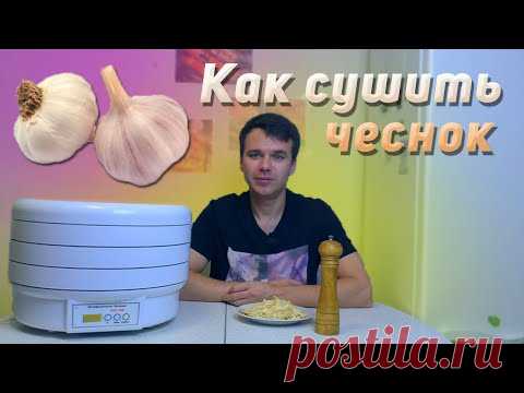 На изображении мужчина сидит перед столом, на котором находятся сушилка, тарелка с сушенным чесноком и солонка. В верхней части изображения надпись "Как сушить чеснок".