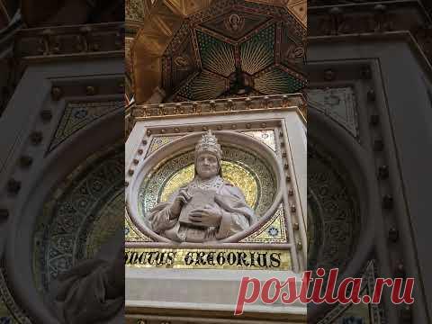 Изображение статуи внутри архитектурного сооружения. Статуя представляет историческую фигуру в религиозной одежде с надписью "GREGORIUS". На заднем плане видны детализированные мозаики и орнаменты.