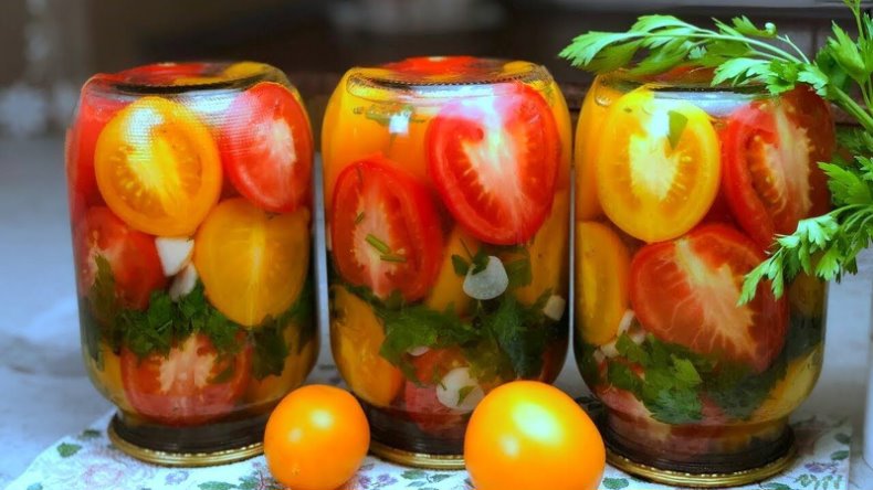 ПОМИДОРЫ на зиму половинки ПОКОРИЛИ ВЕСЬ ИНТЕРНЕТ Вот простой и вкусный рецепт заготовки ассорти помидоров на зиму: Ингредиенты: Красные и жёлтые помидоры Чеснок — по 3 зубка на каждую литровую банку Зелень петрушки (можно заменить укропом, базиликом или сельдереем) Перец горошком — 8-10 штук на банку Сахар — 2 столовые ложки с горкой на каждую банку Соль — 1 чайная ложка с горкой на каждую банку Уксус — 2 столовые ложки на каждую банку Растительное масло без запа...