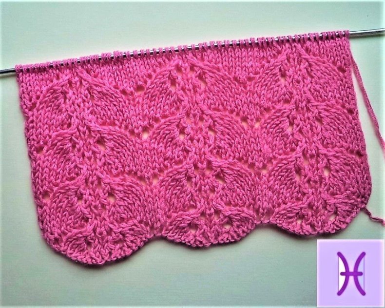 Красивый ажурный узор. Узор с крупным раппортом, с волнистым краем. Узор подходит для вязания шарфов, палантинов, юбок, плечевых изделий. Также прекрасно подойдет для вязания предметов для дома. Плед с такой каймой будет превосходным.