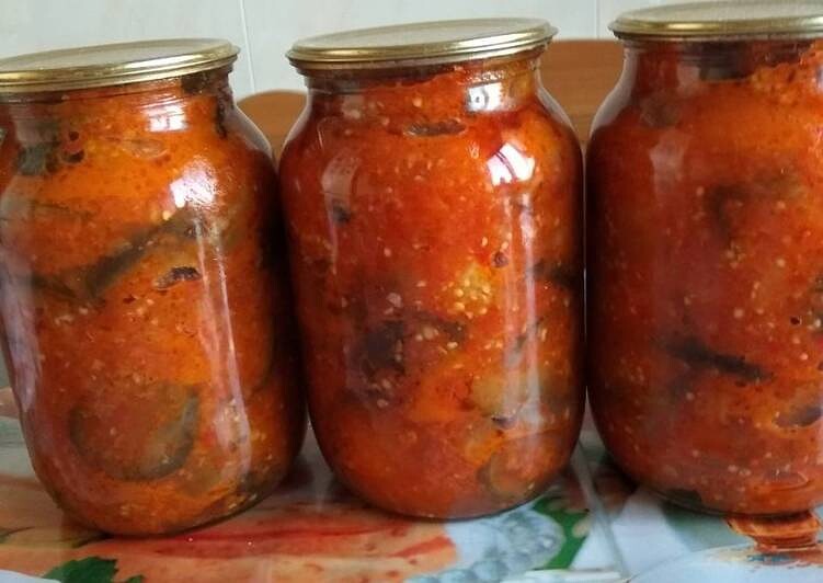 Все овощи помыть, почистить, в том числе и острый перец. Баклажаны нарезать кружками толщиной 0,5 см, обжарить на растительном масле, выложить в ёмкости, закрыть крышкой. Помидоры, чеснок и перцы пропустить через мясорубку, довести до кипения на средне...