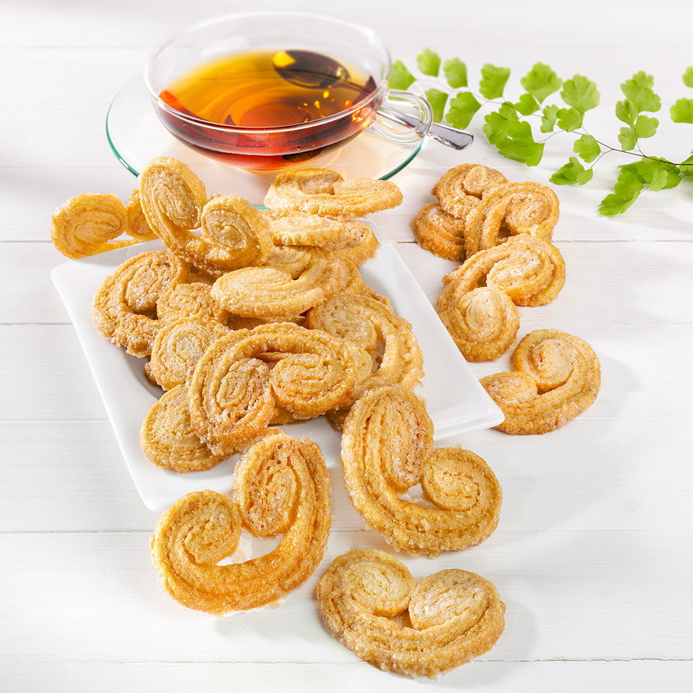 Blätterteiggebäck Teeöhrchen 2er-Set Locker-leicht und knusprig schmeckt dieses hochfeine, handgerollte Blätterteiggebäck aus echtem Butterteig mit 42% frischer Butter. Ein…