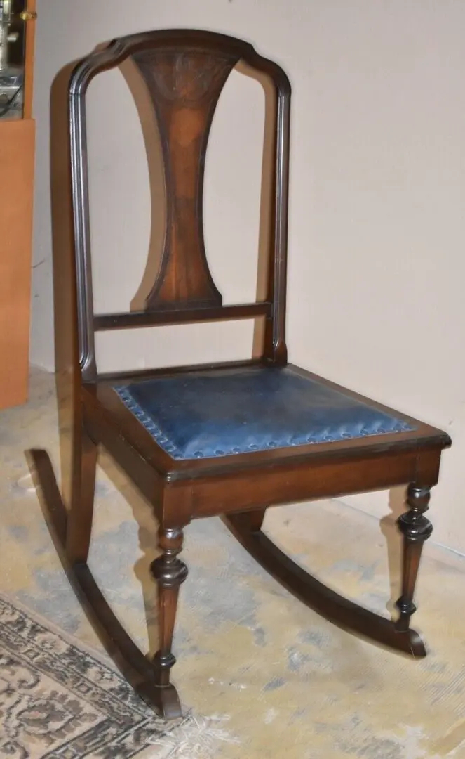 Antique Walnut Child's Leather Seat Rocking Chair, Rocker - The Green Scene Antiques Beautiful Antique Childs Rocking Chair with blue leather seat Made from Walnut Condition: Good vintage condition with minor marks and finish wear appropriate for age use. H: 33″ (15″h to seat) W: 17.5″ D: 27.5″ at rocker legs UPS Ground shipping. The price includes the cost of professional packing/shipping and insurance. Thank you for shopping…
