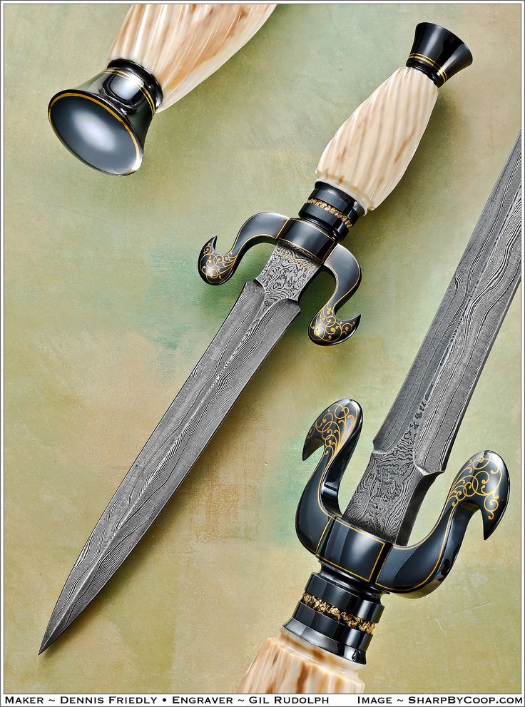Кинжал от Dennis Friedly. Гравировка от Gil Rudolph. Дамасская сталь. Чернение. Всечка золотом. Рог.