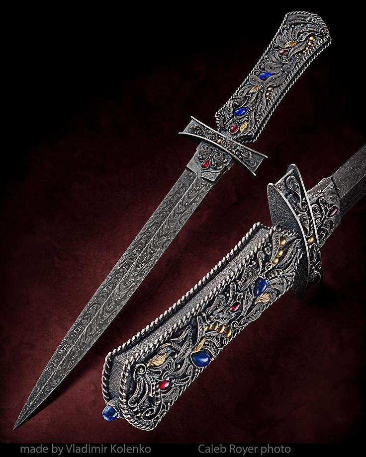 Кинжал от Владимир Коленко (Vladimir Kolenko). Дамасская сталь. Литьё. Золото. Красные и синие камни. Филигрань.