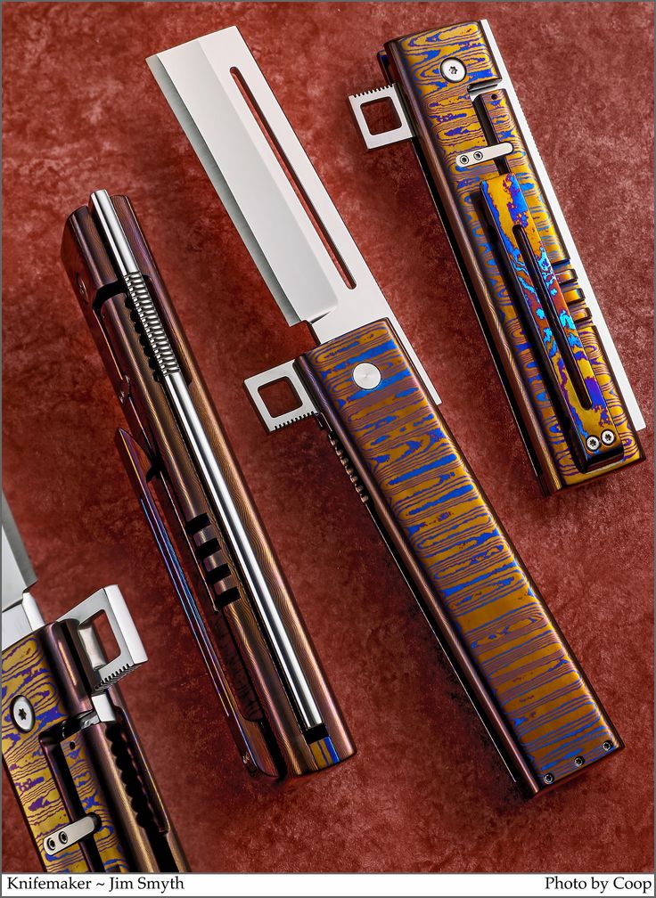 Нож складной от Jim Smyth. Квадратный нож. Оксидированная дамасская сталь.