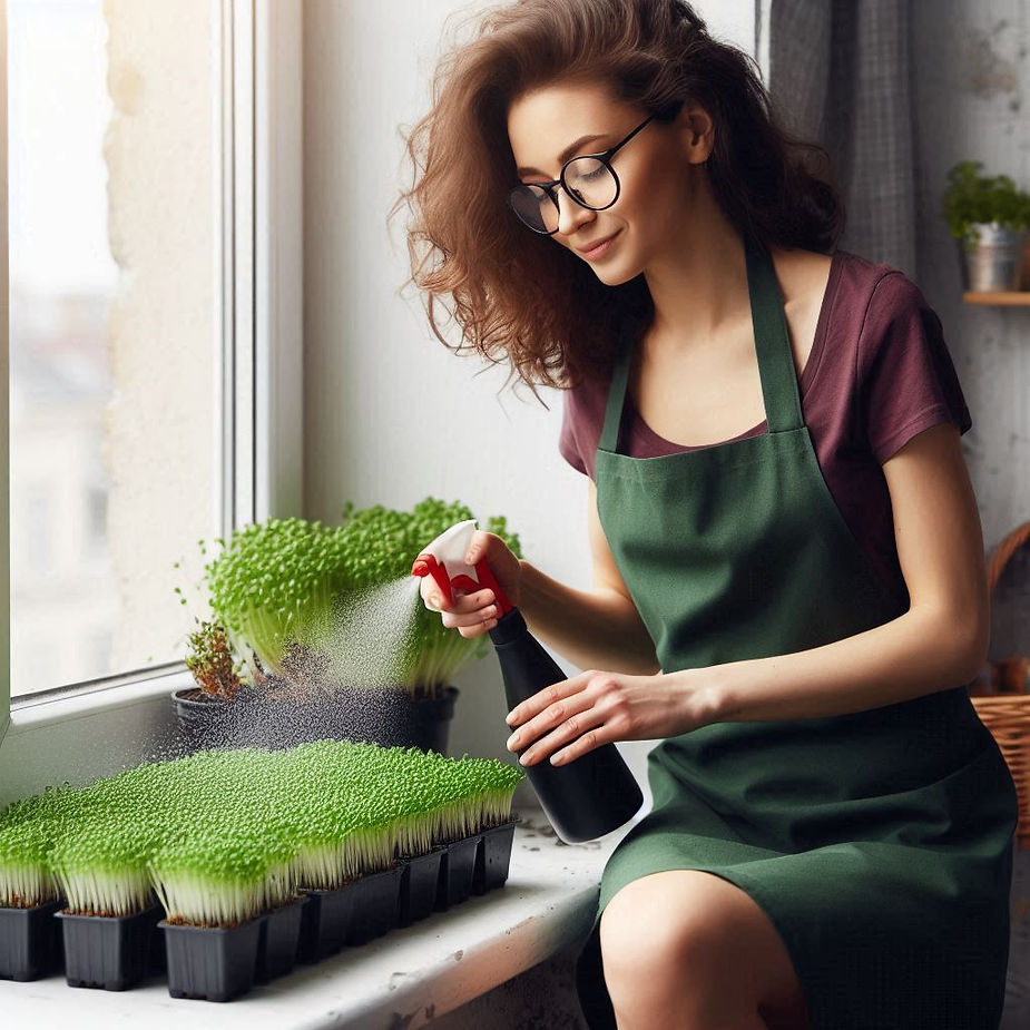 Женщина в очках и зелёном фартуке поливает растения на подоконнике.