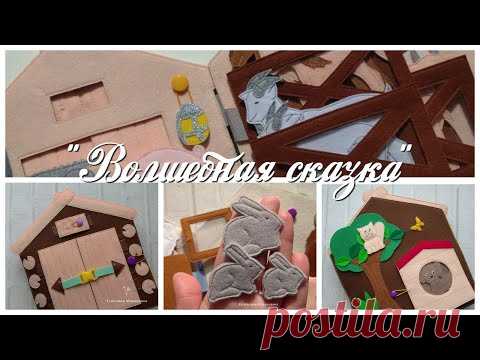 Изображение включает несколько крафтовых изделий из фетра. На верхнем изображении показан домик с дверями, где видны фигуры животных, таких как козел. Нижнее изображение включает подробности других фетровых изделий, таких как дверцы домика, фигурки заек и ещё один домик с элементами дерева.
