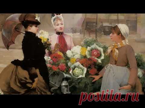 Этот образ изображает троих женщин, стоящих возле прилавка с цветами. Две женщины одеты в элегантные платья и шляпы, третья женщина, вероятно продавец, одета в более простую одежду. На заднем плане виден пейзаж города.