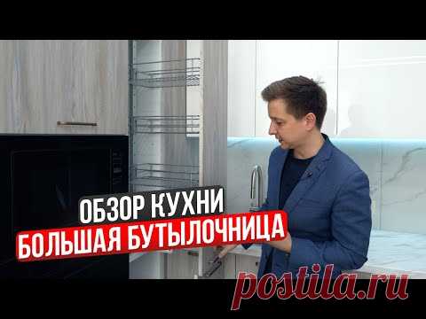 Человек в синем пиджаке показывает кухонный шкаф с выдвижной бутылической секцией. На изображении есть текст: "Обзор кухни. Большая бутылочница".