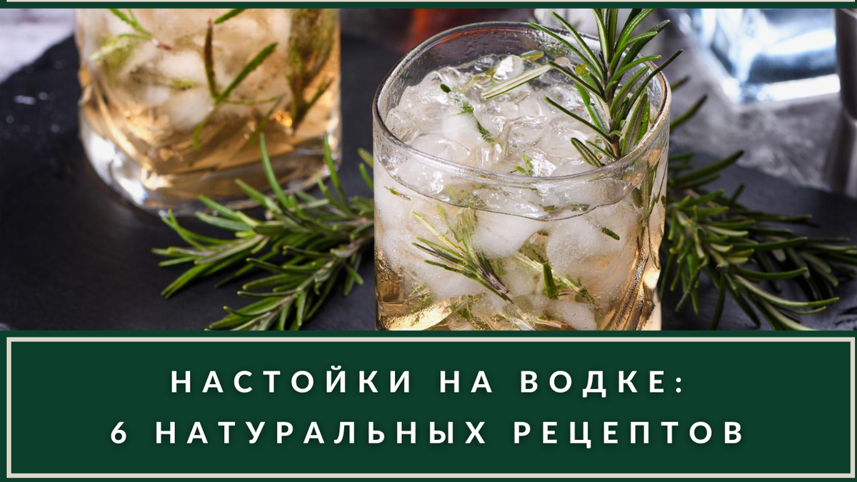 Два стакана с настойкой на водке, украшенные свежим розмарином и льдом. Текст: "Настойки на водке: 6 натуральных рецептов" и логотип "postila.ru".