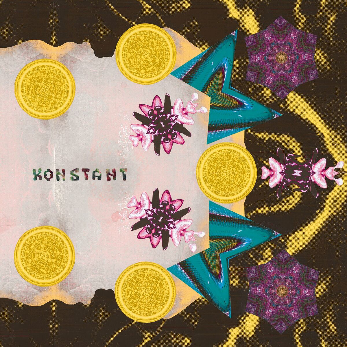Абстрактная композиция с текстом "KONSTANT", украшенная желтыми кругами, розовыми и пурпурными цветами и красочной геометрией.