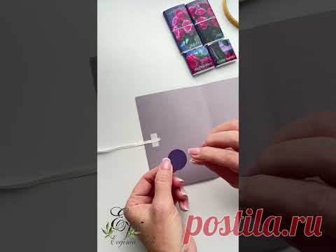 На изображении показан процесс изготовления открытки своими руками. Видны руки, держащие небольшой круг, а также открытка и цветная бумага на заднем плане.